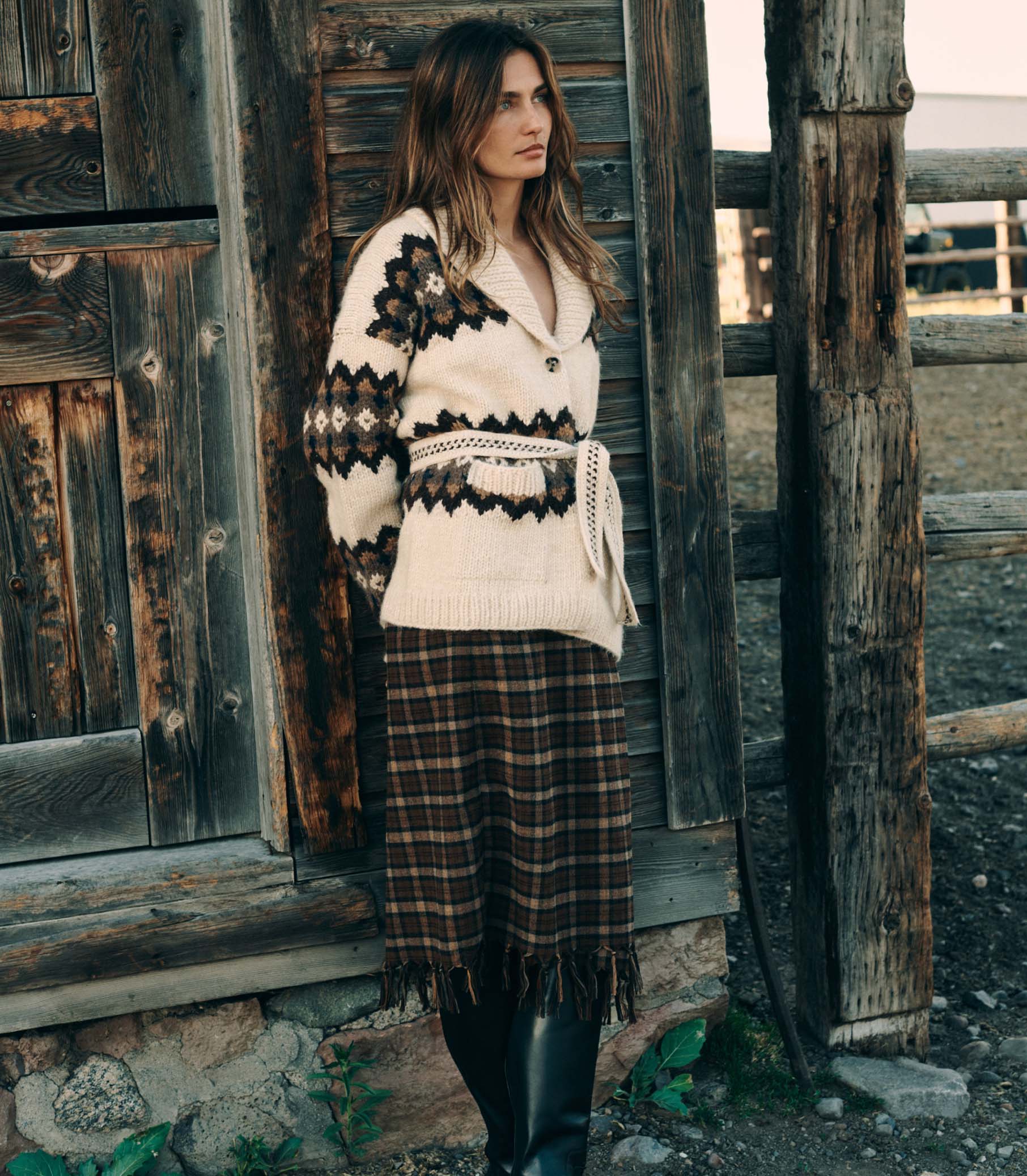 Nodding to alpine sweaters of the 1970s, the DÔEN Heirloom Griffith Cardigan is handknit from a cozy baby alpaca-wool blend. The slouchy silhouette features a shawl collar and faux horn buttons, finished with a detachable crochet belt for styling versatility.