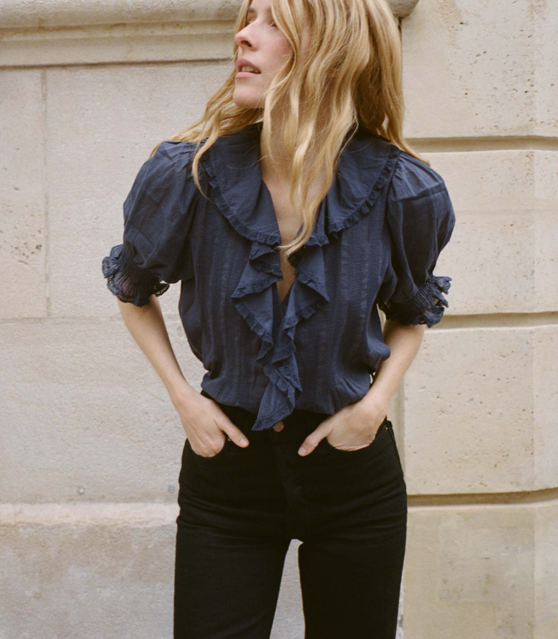 Crafted from the softest organic cotton voile, the Edwardian-inspired Henri Top—which made its debut in Spring 2018—is a Favorite Character we find ourselves returning to again and again. It features a plunging V-neckline framed with cascading lace-trimmed ruffles that extend down the bodice and delicate clustered pintucks at the yoke, back, and short puffed sleeves. A line of hidden starburst buttons run up the center front.