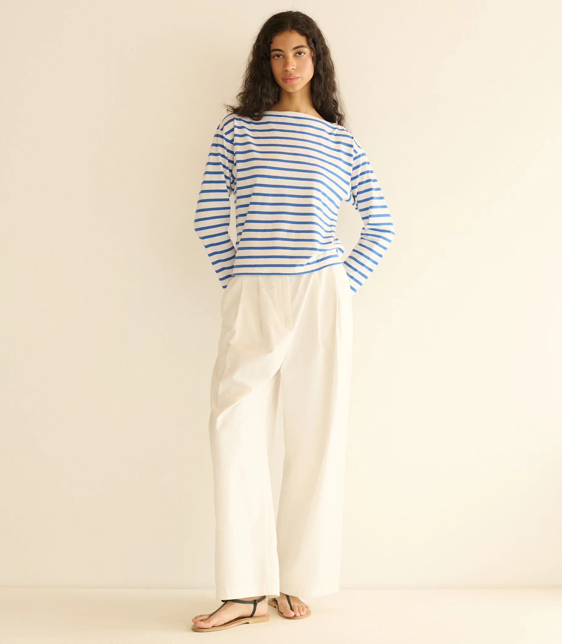 Crafted from soft regenerative cotton, the Irene Tee in Breton Stripe is our take on a classic French marinière stripe. It features a boat neck, full-length sleeves, and a boxy cut.